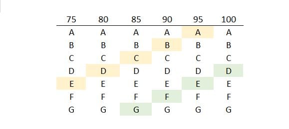 The table below shows the relationship – the orange fields have the same cup volume. The rule of thumb is simple – up one band size, down one cup size. Down one band size, up one cup size.